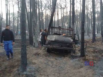 Unimog de Bomberos de Pinamar atrapado por el fuego: dos bomberos pudieron escapar en la pala de una cargadora del Municipio