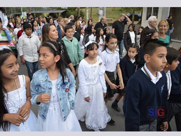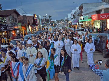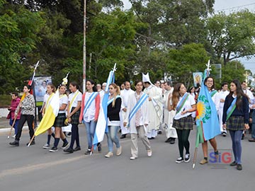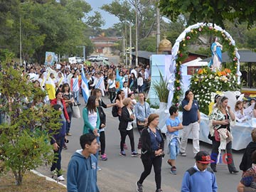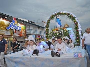 Con gran acompañamiento de feligreses la imágen de la Patrona de la ciudad recorrió el muy poblado centro comercial por avenida tres, desde el paseo 113 hasta las puertas de la Parroquia. En un trailer muy bien decorado y rodeada de “angelitos”, la imágen de la Patrona recibió muetras de admiracion en todo su recorrido, hasta volver a su lugar habitual, centro del altar de la Parroquia. Por detràs, la cupula eclesiastica presente, los chicos de la Primera Comunión de este año, representantes de instituciones y gran cantidad de familias.